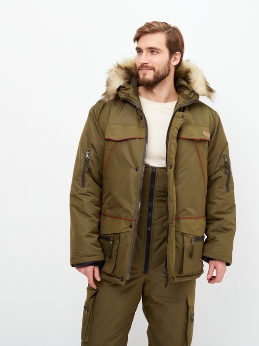 Прямая куртка анатомического кроя закрывается на надежную тракторную молнию свободного хода с двойной ветрозащитной планкой на кнопках. Объемный съемный капюшон с меховой отделкой регулируется по посадке двумя фиксаторами. На рукавах имеются внутренние манжеты (наручи), защищающие кисти от холода и препятствующие проникновению снега внутрь. Куртка прекрасно садится на любую фигуру.